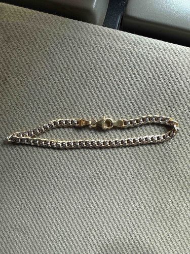 This is a two-tone curb link (Cuban style) bracelet, likely crafted in 14k gold. The piece measures approximately 7 to 8 inches in length and features interlocking flat-faced links. The construction utilizes a classic two-tone aesthetic, where the center of the links appears to be white gold or rhodium-plated silver, while the outer edges and the clasp assembly exhibit a warm yellow gold finish. The bracelet is secured by a sturdy lobster claw clasp, which is a hallmark of modern durability. The clasp assembly shows a visible '14K' or '585' hallmark, suggesting it is of Italian manufacture, a region known for high-quality machine-made chains from the late 20th century to the present. The craftsmanship displays smooth, uniform links with high-polished surfaces that reflect light evenly. Regarding condition, the metal shows light surface scratches and minor signs of wear consistent with regular use, but there are no visible kinks, broken links, or significant deformities in the chain structure. The patina is bright, indicating the piece has been well-maintained. The weight appears substantial, indicating a solid rather than hollow construction, which is a key indicator of higher-end jewelry quality.