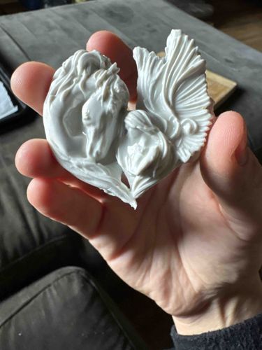 This item is a small, high-relief decorative sculpture measuring approximately 2.5 to 3 inches in height, designed to fit within the palm of a hand. The piece is crafted from a high-quality, slip-cast ceramic or porcelain material with a bright white, glossy glazed finish. The composition is highly stylized and organic, featuring the intertwined forms of a horse's head and a winged angelic figure, which together create a loose heart-like silhouette. The horse on the left side is rendered with a flowing mane that integrates into the overall structure, while the angel on the right is depicted in a bowed, prayerful stance with detailed, scalloped wing feathers that fan outward. The craftsmanship is evident in the sharp, clean lines of the bas-relief and the lack of visible parting lines, suggesting a high-quality mold was used. There are no immediate visible maker's marks or signatures on the front, though such marks would typically be located on the reverse. The item appears to be in excellent contemporary condition with no visible cracks, chips, or crazing of the glaze. It represents a modern, sentimental style likely produced in the late 20th or early 21st century, often sold as a commemorative or inspirational keepsake gift.