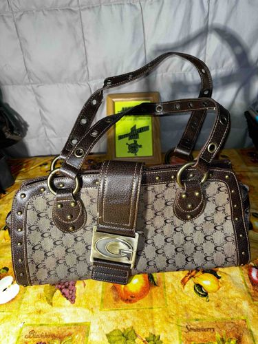 Vintage Guess Monogram Denim and Faux Leather Satchel