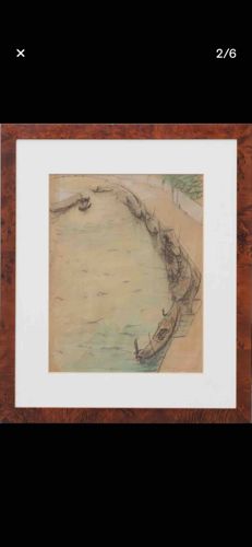 This original pastel drawing on paper, dated 1942, is the work of Italian artist Mario Carraro (1896–1978). The composition captures a quintessential Venetian scene depicting gondolas moored along a curved quay at Piazzale Roma. The artwork utilizes a soft, impressionistic technique with a muted palette of earth tones, pale blues, and greens, characteristic of mid-century Italian landscape studies. The medium appears to be pastel or charcoal with light color washes, showcasing fine line work in the rendering of the gondolas' silhouettes and the water's gentle ripples. The piece is signed by the artist, indicating its authenticity. Physically, the artwork is mounted within a wide white mat and housed in a polished burl wood frame, which adds a layer of mid-century elegance. The paper exhibits a natural aged patina consistent with its mid-20th-century origin. The craftsmanship reflects the skilled hand of Carraro, known for his atmospheric depictions of Venice. The overall condition appears stable, though minor toning of the paper is evident due to age. It serves as a significant example of early 1940s Italian figurative art, specifically documenting the Venetian landscape during a historical period.
