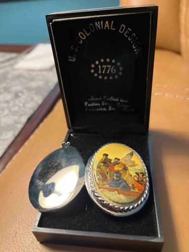 This is a vintage commemorative silver-tone oval locket featuring a full-color reproduction of Emanuel Leutze's 'Washington Crossing the Delaware' on the front face. The locket is an oval shape, bordered by a decorative twisted rope or cable pattern bezel, which signifies classic American craftsmanship aesthetics. The reverse of the locket appears to be a high-polish silver-toned metal, possibly pewter or silver plate, showing a slight reflection. It comes in its original black presentation box with a velvet-lined interior. The interior lid is marked with 'U.S. COLONIAL DESIGNS' in gold-tone lettering, featuring thirteen stars surrounding the date '1776,' and handwritten-style script indicating the piece is 'Hand Crafted' from materials including pewter, silver, and copper. This item likely dates to the mid-1970s, produced to coincide with the United States Bicentennial celebrations. The condition appears excellent with minimal surface wear; the hinge seems intact, and the image on the front is vibrant with no visible chipping or fading. The craftsmanship indicates a mass-marketed but high-quality souvenir or collector's piece typical of the era, intended for patriotic remembrance and functional jewelry use.