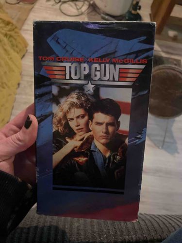 This is a vintage VHS copy of the 1986 action film 'Top Gun', starring Tom Cruise and Kelly McGillis. The item features the iconic theatrical poster art on the front slipcover, which is constructed from standard lightweight cardstock. The color palette is dominated by deep blues and reds, reflecting the patriotic themes of the movie, with high-contrast imagery of a fighter jet and the lead actors. In terms of condition, the slipcover shows visible signs of shelf wear and age. Notable distress is present along the top edge, where the cardboard is white and frayed, likely from frequent handling or removal from a storage shelf. There is also moderate rubbing and some slight surface loss along the vertical edges and bottom corners. The glossy finish of the cardboard shows fine superficial scuffing, which is typical for a consumer-grade media product from the late 1980s or early 1990s. The 'Top Gun' logo is prominently displayed with its signature silver-grey gradient and red-white-blue wing emblem. This specific release is a mass-market production by Paramount Home Video. While used and showing signs of play-related wear, the graphic integrity remains largely intact, making it a classic piece of mid-to-late 20th-century home entertainment memorabilia. No significant tears, moisture damage, or heavy crushing are visible, though the upper left corner shows a minor crease.
