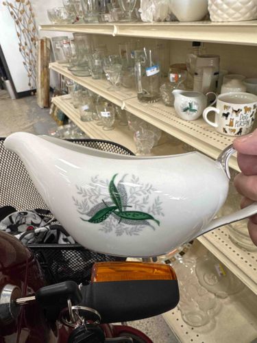 Mid-Century Modern Fine China Gravy Boat with Silver Rim and Foliage Motif