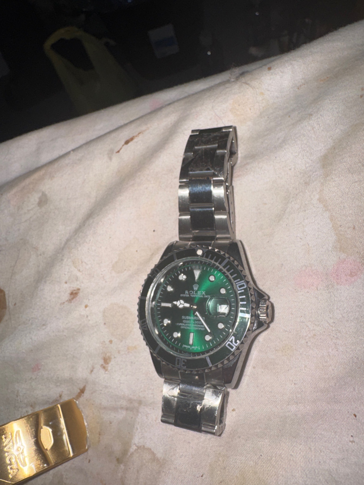 This is a stainless steel diver's wristwatch featuring a distinctive sunburst green dial and a matching green ceramic unidirectional rotating bezel, famously nicknamed the 'Hulk' by collectors. The watch is constructed from what appears to be Oystersteel (904L stainless steel style) with a 40mm case diameter. Notable features include the signature Rolex crown logo at 12 o'clock, 'Mercedes' style hands, and a date window at the 3 o'clock position magnified by a cyclops lens. The dial text includes 'ROLEX OYSTER PERPETUAL DATE' and 'SUBMARINER 1000ft=300m SUPERLATIVE CHRONOMETER OFFICIALLY CERTIFIED'. The bracelet is an Oyster-style link bracelet with polished center links and brushed outer links. Regarding condition, the watch shows significant signs of wear and handling; there are visible smudges, grime, and heavy scratches across the crystal, bezel, and bracelet links. The polishing on the center links appears inconsistent with factory standards, and the bracelet links show gaps that may indicate aftermarket construction or heavy wear. The overall finish and finishing around the crown guards suggest this specific example may be a replica rather than an authentic timepiece. The style is modern, originally released in 2010, though the craftsmanship quality here appears lower than genuine Swiss luxury standards.