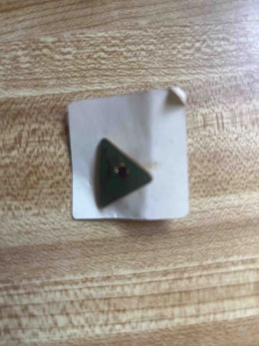 This item is a small, vintage ornamental accessory, likely a lapel pin or a tie tack, currently presented on a square white paper or cardstock backing. The pin features a distinctive isosceles triangular shape with slightly rounded corners. Its color is a deep forest green, which appears to be achieved through an enamel coating or a polished stone inlay such as jade or aventurine over a metal base. Centrally positioned on the face of the triangle is a small circular element, possibly a metal setting or a tiny inset stone, which serves as a focal point. Based on the style and construction, the item likely dates from the mid-20th century, approximately the 1950s to 1970s. The size is estimated to be approximately 1/2 to 5/8 of an inch in height. The craftsmanship suggests a mass-produced but quality-controlled accessory intended for business or formal wear. Regarding condition, while the image is slightly out of focus, the enamel or stone surface appears generally intact without large visible chips, though there is a soft patina suggest of age. No specific maker's marks are visible on the front; such hallmarks would typically be located on the reverse metal clutch or the pin stem itself. The simple geometric aesthetic is characteristic of Mid-Century Modern design.