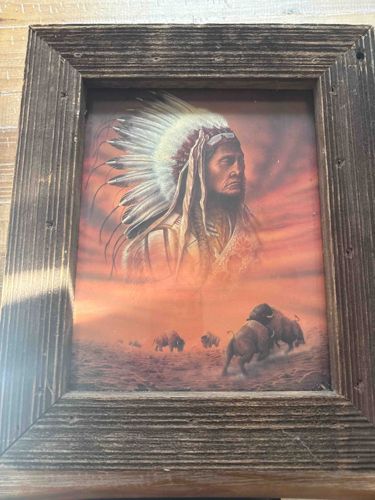 This item is a composite art print depicting a Native American chieftain in a full feather headdress superimposed over a landscape of American buffalo (bison). The artwork features a warm, sepia-toned palette dominated by oranges, browns, and deep reds, evoking a sunset or 'Golden Hour' atmosphere. The chieftain's portrait is rendered with significant detail, showing realistic facial features and a complex headdress with white feathers and dark tips. Below, the lower third of the composition shows buffalo fighting or roaming across a prairie. The piece is housed in a wide, rustic wooden frame characterized by deep machine-carved vertical grooves and a weathered, dark brown finish. The frame shows visible signs of age and wear, including several circular holes likely from mounting or previous hardware, and visible particulate/dust accumulation at the mitered corners. The print itself appears to be on a flat surface, potentially paper or thin board, and lacks a visible glass cover in the image. This style of decorative art was highly popular in the late 20th century (circa 1980s-1990s) as part of the Western-themed home decor movement. The craftsmanship of the frame suggests mass production designed to mimic reclaimed barn wood.