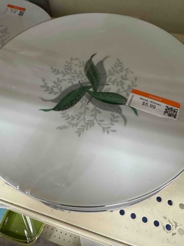 This is a set of circular dinner plates, appearing to be crafted from high-quality fine china or porcelain characterized by a bright white, translucent body. The central decorative motif features a stylized mid-century botanical design consisting of three primary lancet-shaped leaves in a rich forest green hue with stippled black detailing for texture, surrounded by a delicate wreath of smaller gray secondary leaves and sprigs. The rim is elegantly finished with a thin silver or platinum band, which is a common feature of formal dinnerware from the mid-20th century. While the specific manufacturer is not visible without a backstamp, the aesthetic strongly suggests a 1950s or 1960s production era, often associated with brands like Noritake, Mikasa, or Rosenthal. The plates appear to be in good vintage condition with the glaze maintaining a high luster, though there is a visible orange Goodwill price sticker and clear plastic wrapping that may obscure minor surface scratches. No large chips or cracks are immediately evident in this top-down view. The craftsmanship displays the precise application of decals and metallic edging typical of higher-end household ceramics from the period.