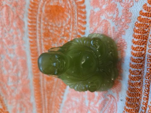This item is a small, hand-carved figurine of the Laughing Buddha (Hotei or Budai), crafted from a translucent to semi-opaque green mineral, likely nephrite jade or a similar green hardstone such as serpentine. The carving exhibits a rich, olive-green to forest-green coloration with subtle internal clouding and natural variations in saturation. The figure is depicted in a traditional seated pose with a large, exposed belly, elongated earlobes symbolizing wisdom, and a jovial facial expression featuring deeply carved eyes and a wide grin. The craftsmanship shows smooth, rounded contours with high-polish finishing, though some minor surface abrasions and internal fractures are visible upon close inspection, typical of natural stone items. The piece appears to be a 20th-century decorative object, likely produced in East Asia. The overall condition is good, with no major chips or structural repairs noted, preserving the fluid lines of the robes and the distinctive anatomy of the character. The stone's waxy luster and cool-to-the-touch property are characteristic of quality nephrite carving. The bottom appears flat to allow for stable display, though no maker's marks or signatures are immediately visible on the surface.