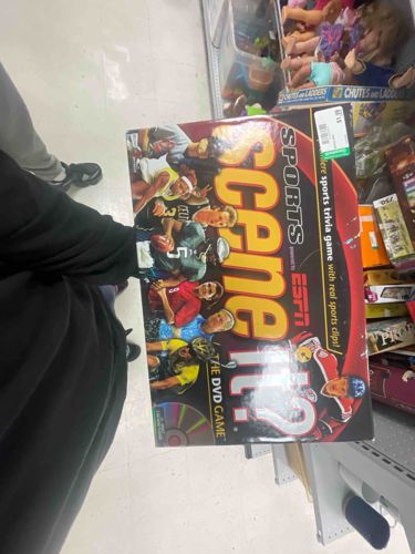 This is a large-format board game box for 'Scene It? Sports,' a trivia-based entertainment product powered by ESPN. The front of the box features high-impact graphic design with a vibrant color palette of yellow, red, white, and black. It displays a variety of professional athletes representing different sports including football, basketball, cycling, baseball, soccer, and golf to illustrate the diversity of the trivia content. The text 'Scene It?' is prominently featured in large, stylized yellow and white fonts. The box is made of glossy cardstock and is rectangular in shape, typical of mid-2000s board game packaging. A notable feature is the inclusion of a DVD, highlighted by an icon on the lower left, which indicates that the game incorporates multimedia video clips for interactive play. The condition of the box shows some signs of handling and storage wear; the corners appear slightly softened, and there is a visible thrift store price tag '5.99' and a green circular sticker on the upper right side. The overall construction suggests a mass-produced consumer product from the early to mid-21st century, designed for high-energy family or social play. There are no signs of major structural damage like crushing or tearing, though the glossy finish shows some light reflection and surface scratching consistent with a pre-owned item found in a retail or thrift environment.