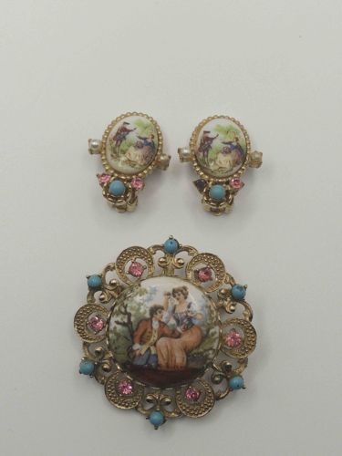 Vintage Coro Fragonard Limoges-Style Brooch and Earrings Parure Set