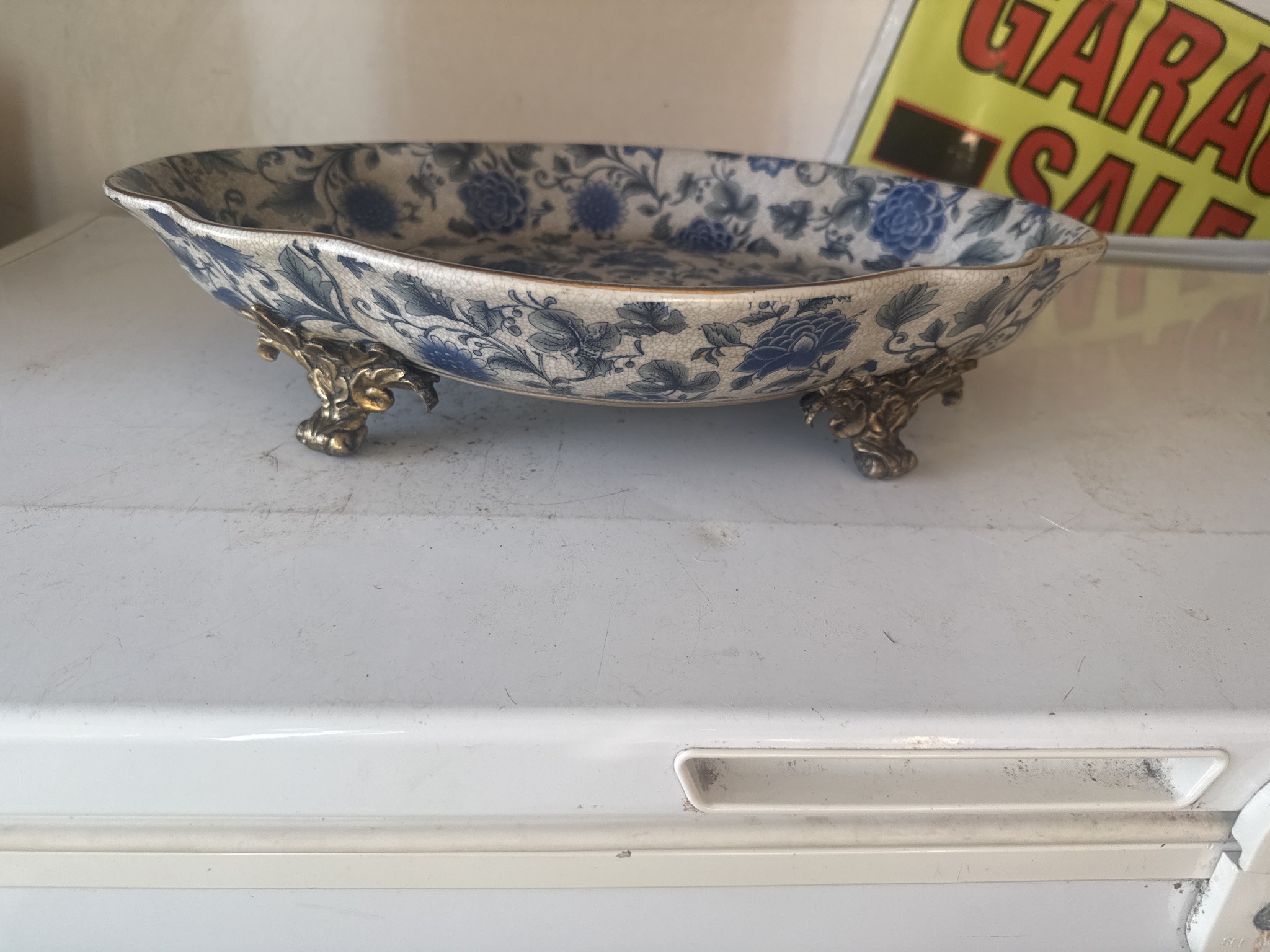 This is a low, oval-shaped decorative ceramic bowl featuring a blue and white transferware floral pattern, commonly referred to as Chinoiserie. The bowl is constructed from earthenware or porcelain with a distinctive crazed glaze extending across both the interior and exterior surfaces. The floral motif consists of dense peony-like blooms and foliage in varying shades of cobalt blue against a creamy white background. A notable feature of this piece is its mounting on four ornate, cast-metal feet, likely brass or bronze-plated, designed in an asymmetrical Rococo or scroll-work style. The rim of the bowl is slightly scalloped and bears a thin gold-toned or brass-effect metallic band around the edge. In terms of condition, the piece shows significant intentional or age-related crazing (fine cracking of the glaze), which is often seen in vintage-style reproductions or antique earthenware. There appears to be a heavy patina and some green oxidation (verdigris) on the metal feet, suggesting age or exposure to moisture. While the exact maker's mark is not visible, the style of the transferware and the ornate metal mounts suggest a late 19th-century aesthetic, though it may be a high-quality mid-20th-century decorative reproduction. The craftsmanship is evident in the alignment of the transfer pattern and the intricate casting of the support feet.