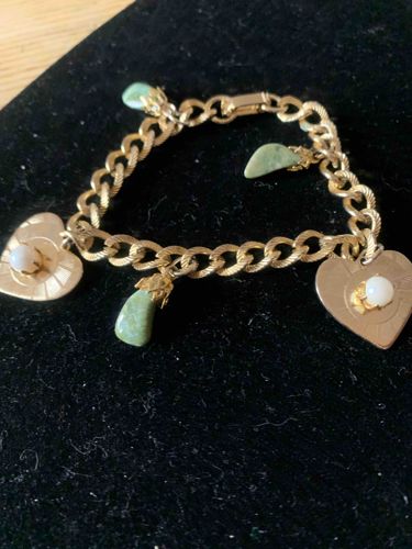 Vintage Gold-Tone Charm Bracelet with Jade-Style and Faux Pearl Heart Pendants