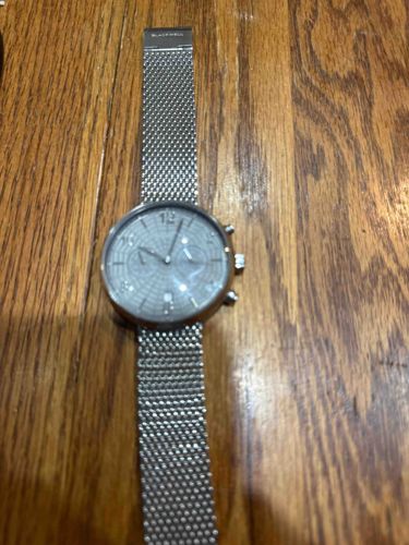 This is a contemporary men's chronograph watch featuring a circular stainless steel case and a distinctive silver-tone mesh (Milanese) strap. The dial is characterized by an intricate textured geometric grid pattern, which provides a modern, architectural aesthetic. It includes three sub-dials for chronograph functions and a small date window located at the 6 o'clock position. The hour markers are minimalist, with a prominent '12' at the top. The watch is equipped with two pushers and a central fluted crown on the right side of the casing. The brand name 'BLACKWELL' is clearly engraved on the clasp of the mesh band. Physically, the watch appears to be in fair condition; however, there is visible scratching on the crystal covering the face and some minor scuffs on the bezel, suggesting regular wear. The mesh strap appears intact without significant kinking or broken links. The overall style is consistent with 21st-century fashion watches, emphasizing a sleek, monochromatic silver palette that prioritizes modern design over traditional horological complexity.