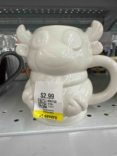 This item is a novelty drinkware piece, likely a ceramic mug, shaped like a stylized reindeer or moose character. The item is constructed from thick-walled ceramic or stoneware with a uniform, glossy white glaze finish over its entire surface. Physically, it features a bulbous body integrated with a thick handle on the right side. The design includes sculpted three-dimensional details: two rounded antlers or horns at the top, large circular eyes, a prominent snout, and what appears to be a scarf or collar textured around the neck. The character is also holding its paws or mittens toward the front. Regarding condition, the glaze appears intact without visible chips, cracks, or crazing, though a retail adhesive sticker from Savers priced at $2.99 is prominently applied to the front, which may leave residue. This mass-produced contemporary item lacks visible maker's marks from this angle but is characteristic of seasonal or holiday-themed kitchenware often found in retail stores like Target or Walmart within the last 10-15 years. The craftsmanship is standard for commercial ceramics, emphasizing functional novelty over fine artistry.