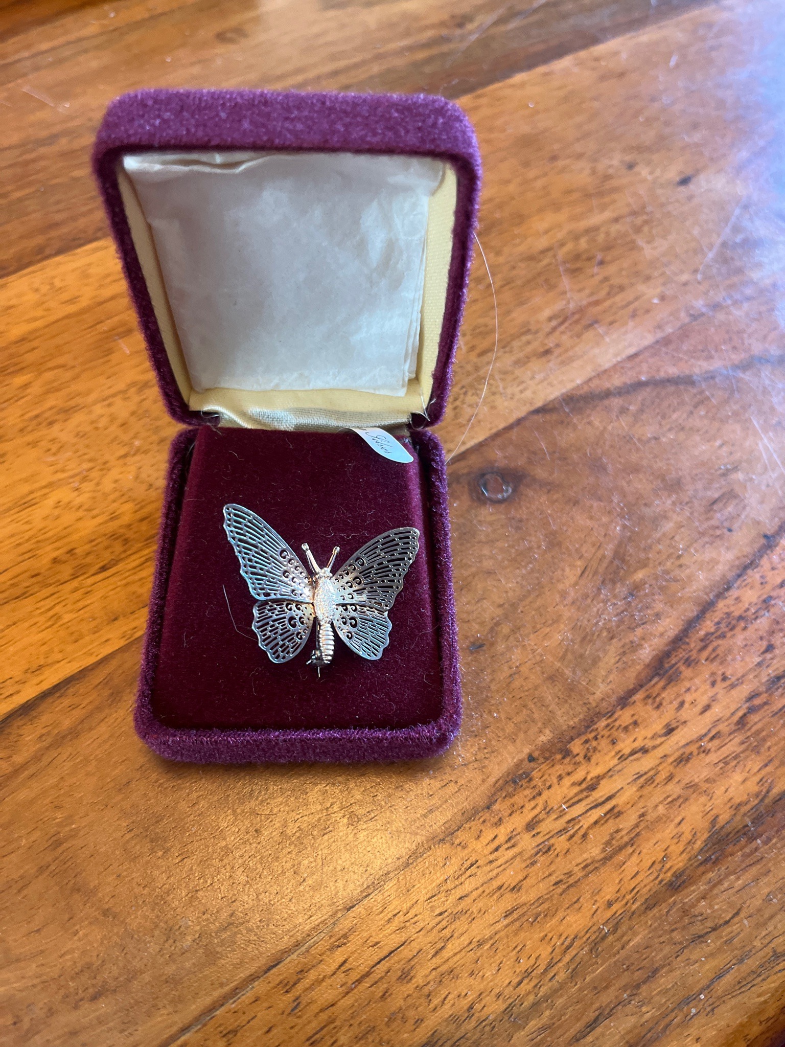 This is a vintage silver-tone butterfly brooch featuring intricate filigree metalwork. The piece is crafted using thin wired ribbons of metal, likely sterling silver or silver-plated metal, to create high-detail openwork wings. The wings exhibit a delicate pattern of scrolls and geometric lace-like textures, characteristic of high-quality mid-20th-century filigree craftsmanship. The body of the butterfly is solid and textured to mimic biological segments, topped with two small antennae. The overall appearance suggests a style popularized in regions such as Italy (specifically Genoa), Portugal, or Israel between the 1940s and 1960s. The brooch is displayed in a vintage-style hinged presentation box with a deep plum or burgundy velvet lining and a white silk or satin lid liner, which shows some yellowing and fraying consistent with age. A small paper tag labeled 'Silver' is visible inside the box, further supporting its material composition. The brooch itself appears well-maintained with a light, even patina and no visible breaks in the delicate wirework. The metal displays a bright luster with minimal tarnishing, indicating it has been carefully stored. The craftsmanship is refined, showing excellent symmetry and fine soldering points throughout the complex wing structure.