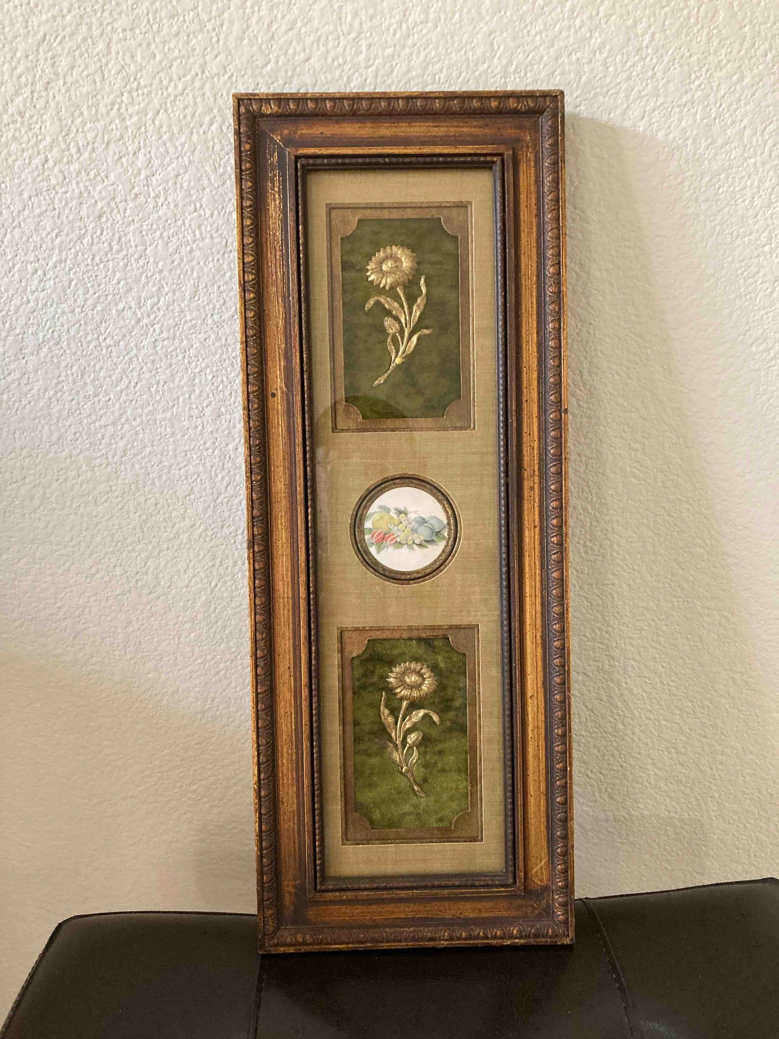This is a vertically oriented, rectangular decorative wall plaque manufactured by the Hal Kramer Co. of Chicago, likely dating from the 1960s or 1970s. The piece features a multi-tiered shadowbox design housed within a tiered wooden frame finished in an antiqued gold gilt with a dark wash, displaying a beaded 'egg and dart' style inner border. The primary matting is an oatmeal-toned woven linen fabric. Within this frame are three distinct decorative elements: the top and bottom sections feature matching golden-toned metal flower reliefs (resembling marigolds or sunflowers) mounted against a moss-green velvet textured background within scalloped borders. The center section contains a circular porcelain cameo or tile featuring an multi-color fruit still life motif consisting of grapes, peaches, and berries. The overall construction exhibits the 'Hollywood Regency' or French Provincial revival style popular in mid-20th-century home decor. The frame shows minor signs of age-related wear including light scuffing on the corners and a gentle patina on the gilded surfaces, though the internal elements appear well-preserved under glass. The craftsmanship is representative of mass-market boutique decor of the period, utilizing a mix of wood, metal, and textile elements to create a layered, multi-media effect.