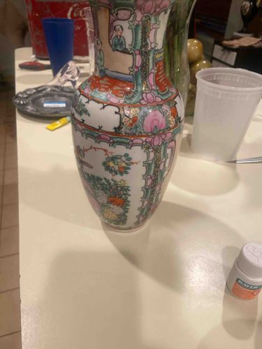 This is a classic Chinese export porcelain vase executed in the 'Rose Medallion' pattern, a style originating in the mid-19th century and remaining popular through the 20th century. The vase features a traditional baluster shape with a flared rim, a tapering neck, and a bulbous body on a raised foot. The decoration is organized into alternating scenic and floral reserves (panels). The scenic panels depict courtly figures in indoor settings, while the floral panels include birds, butterflies, and flowers such as peonies and hibiscus. These 'windows' are framed by a dense 'famille rose' ground consisting of green scrolling vines, pink peony blossoms, and gold-flecked accents. The materials consist of hand-painted overglaze enamels on a white porcelain body. Notable features include the use of gilding and the distinct pink ('rose') palette that gives the style its name. The craftsmanship shows typical production from the late Qing Dynasty to the early Republic period (circa late 19th to early 20th century), characterized by vibrant enamels and fine line work defining the figures. There appears to be some light surface wear and minor rubbing to the gilt and enamels consistent with age, but no major chips or cracks are visible from this angle. The glaze is glossy, indicating a well-preserved surface.