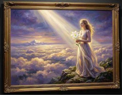 This item consists of a contemporary representational oil or acrylic painting on canvas, housed within an ornate gilded frame. The artwork depicts a blonde woman in a flowing white classical-style gown, standing upon a rocky precipice above a dense sea of clouds. She holds a large white lily, and a dramatic shaft of divine light descends from the upper left, illuminating her and the surrounding atmosphere. The color palette is dominated by ethereal purples, golds, and whites, suggesting a spiritual or transcendental theme. The painting exhibits a smooth, blended brushwork technique characteristic of modern inspirational or fantasy realism. The frame is a substantial, wide-profile wood or composite construction with a brilliant gold finish, featuring prominent acanthus leaf corner ornaments and a beaded inner liner. The condition appears to be excellent with no visible craquelure, paint loss, or frame damage, indicating a relatively recent production, likely late 20th or early 21st century. The craftsmanship reflects a high-quality commercial or gallery-level production, intended for decorative or devotional use. The composition uses classic chiaroscuro elements to focus the viewer's eye on the central figure, creating a sense of peace and enlightenment.