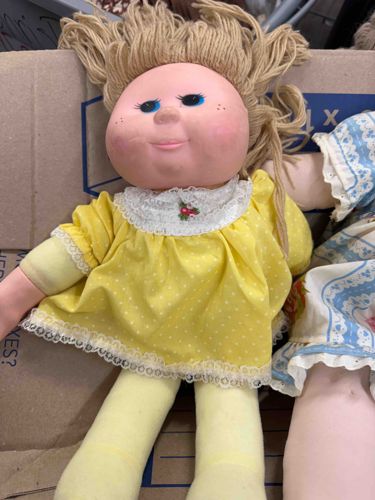 This is a vintage Cabbage Patch Kids doll, likely dating from the mid-1980s, manufactured by Coleco. The doll features the iconic molded vinyl head with a matte finish, characteristic 'chubby' cheeks, a dimpled chin, and painted blue eyes with detailed eyelashes. It has sandy-blonde yarn hair styled in multiple strands. The doll is wearing a yellow polka-dot dress with white lace trim and a small floral embroidery detail at the neckline, over matching yellow fabric legs. Physically, the doll appears to have a soft fabric body. Notably, there are visible 'freckles' on the cheeks. In terms of condition, the vinyl face shows some light surface grime and minor scuffing consistent with age and play. The hair appears somewhat frizzy and unkempt. The fabric components show light fading but no major tears or staining are immediately visible in the frame. These dolls originally featured an artist's signature (Xavier Roberts) on the backside, which is a key authenticity marker for this period. The craftsmanship is typical of 1980s mass-market plush toys, designed for durability.