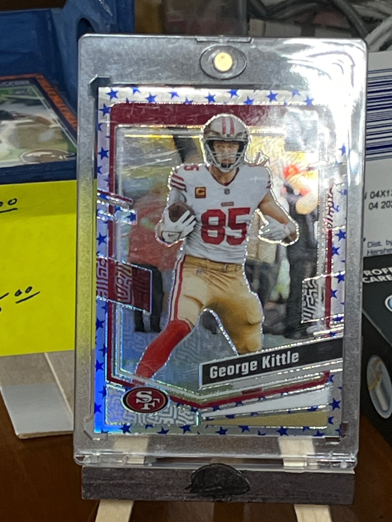 This is a modern collectible sports trading card featuring San Francisco 49ers tight end George Kittle. The card is a 2022 Panini Prizm 'Red White and Blue' parallel, distinguished by its patriotic star-patterned border in shades of blue and silver with red accents. Kittle is depicted in his full white 49ers away jersey with the number 85 and gold pants, clutching a football. The card utilizes a high-gloss, holographic chromium finish that reflects light in a prismatic fashion. The design includes a die-cut style silver border around the player image and a 'C' captain's patch visible on his jersey. The card is currently housed in a clear magnetic 'One-Touch' professional rigid plastic holder designed for long-term protection. Visible condition notes include minor surface scratches on the protective case itself, though the card's centering appears slightly weighted towards the right edge. The corners of the card appear sharp under the plastic, and the color saturation is vibrant with no signs of fading. This specific parallel is a retail-exclusive insert known for its limited production compared to base cards, though it is not individually numbered on the front.