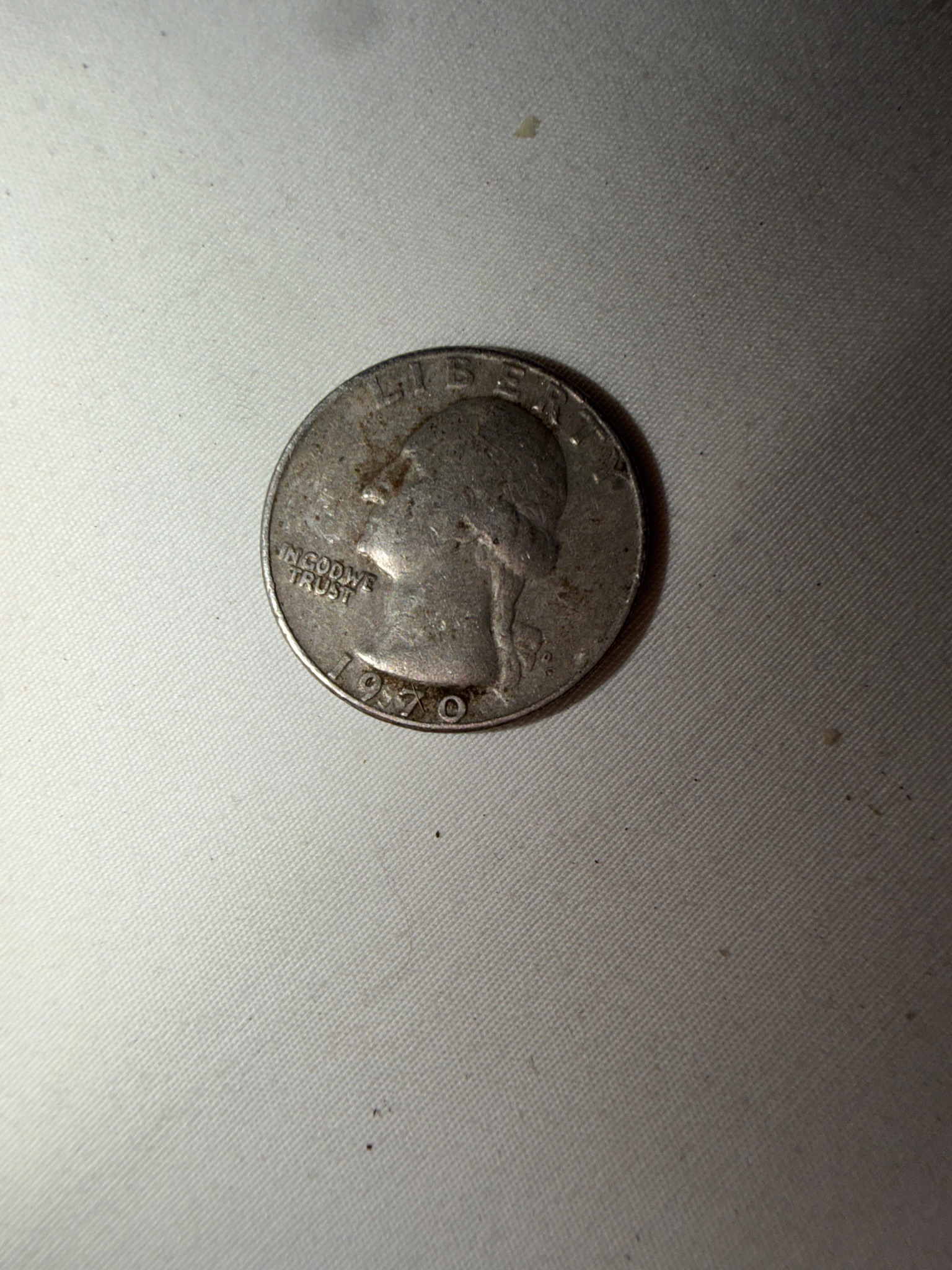 This is a 1970 United States Washington Quarter. The coin is composed of a copper-nickel clad over a pure copper core, standard for post-1964 circulation coinage. It features the left-facing profile of George Washington as designed by John Flanagan. The obverse displays the word 'LIBERTY' at the top, the motto 'IN GOD WE TRUST' on the left, and the date '1970' at the bottom. A small 'D' mint mark is visible to the right of Washington's ponytail, indicating it was struck at the Denver Mint. Physically, the coin shows significant signs of heavy circulation and environmental exposure. The surface has a dull, grayish patina with visible areas of dark oxidation and surface grime. There is notable wear on high points, specifically George Washington's hair and cheekbone. The rim displays multiple minor nicks and scratches consistent with decades of use. The strike appears standard for the era, though the heavy wear has softened the finer details of the hair and the lettering near the edges. Despite the metallic composition, the coin lacks its original luster and shows no signs of being a proof strike or a rare error variety based on this visual inspection.