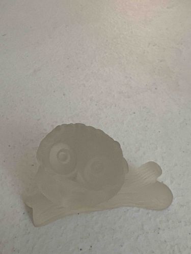 This item is a decorative figurine depicting a stylized owl perched horizontally on a textured branch. The piece is crafted from translucent glass with a comprehensive frosted or 'satin' finish, which diffuses light across its surface for a soft, velvety appearance. Physically, the figurine features oversized, concentric-circle eyes that are a hallmark of mid-century whimsical glass design. The body of the owl is rounded with minimal feather detailing, while the branch base exhibits molded ridges to simulate wood grain. The material appears to be a pressed glass, likely from a mid-to-late 20th-century manufacturer such as Fenton, Viking, or a similar American art glass house. The color is a neutral semi-white frosts, potentially 'camphor glass' style. Regarding condition, the piece shows no immediate chips or cracks in the photograph, though satin glass is prone to 'flea bites' along the base and can pick up gray scuff marks from contact with other surfaces. There are no visible maker's marks or signatures on the upper surface, though a logo might be present on the underside of the base. The craftsmanship displays a high level of uniformity in the acid-etching or sandblasting process used to achieve the matte texture, suggesting professional factory production rather than an individual artisan piece. This style of glass was popular between the 1960s and 1980s as a giftware item.