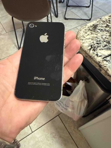 This is an Apple iPhone 4, characterized by its iconic industrial design featuring a glass front and back panel held together by a stainless steel band that doubles as the cellular antenna. The device is finished in black with a polished silver apple logo and standard 'iPhone' branding on the lower rear panel. This specific model features a 3.5-inch Retina display (not visible) and a 5-megapixel rear camera with LED flash located at the top left. The condition shows moderate signs of use including surface smudges, fingerprints, and minor scratches visible on the rear glass under direct light. The steel bezel exhibits some micro-abrasions consistent with its age, approximately from the 2010-2011 era. The text on the lower back identifies it as Model No. A1332, an early GSM model. Design hallmarks of this generation include the sharp, squared-off edges and the high-quality glass-and-metal construction that marked a significant departure from previous plastic iPhone iterations. The craftsmanship is high-grade consumer electronics standard, with flush buttons and precise cutouts for the speakers and 30-pin dock connector.