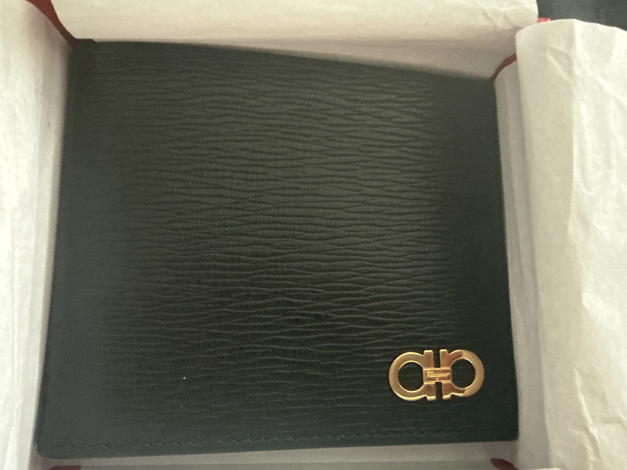 This is a luxury men's bifold wallet crafted by the Italian fashion house Salvatore Ferragamo. The item is constructed from high-quality black hammered (pebbled) calfskin leather, characterized by a deep, linear grain texture that provides both a sophisticated matte aesthetic and increased durability against scratches. A prominent gold-tone double Gancini ornament is affixed to the bottom right corner, serving as the brand's signature hardware. The stitching along the edges is tonal and exceptionally uniform, indicating high-end craftsmanship and hand-finished detailing. Inside the wallet, although partially obstructed, the leather appears to maintain the same black color scheme typical of modern Ferragamo small leather goods. The item appears to be in 'like-new' or 'mint' condition, resting in its original red presentation box with white tissue paper lining, showing no visible signs of wear, corner scuffing, or metal tarnishing. This specific style represents a contemporary classic in luxury accessories, blending functional minimalist design with iconic heritage branding. The overall construction suggests it is a modern-era piece, likely produced within the last 5-10 years, and maintains its original structural integrity and vibrant hardware finish.