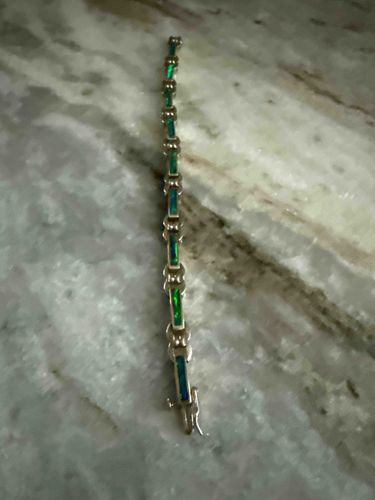 This fine jewelry piece is a link-style bracelet constructed from yellow gold, featuring rectangular bar links inlaid with vibrant green and blue fire opal. Each opal segment is channel-set within a gold frame, alternating with smaller polished gold spacers that likely contain hinge mechanisms for flexibility. The opals display a strong play-of-color, predominantly in electric green and deep blue hues, characteristic of Australian black opal or quality lab-created triplets. The bracelet includes a secure box clasp with a dual safety latch (figure-eight safety catch) at the end, indicating high-quality construction intended for secure wear. The metal surfaces show a bright, polished finish with minor surface abrasions consistent with light use. The style is indicative of late 20th-century contemporary design, likely circa 1980s-1990s. The craftsmanship appears precise, with uniform link sizing and flush-set inlays that demonstrate professional lapidary and goldsmithing work. No visible cracks are noted in the inlay material, and the overall structural integrity of the articulated hinges appears solid.