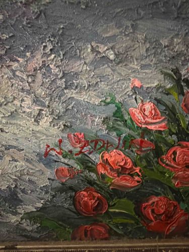 This item is an original oil painting on canvas featuring a dynamic floral still life, specifically focusing on a cluster of red roses. The piece is characterized by a heavy 'impasto' technique, where the paint is applied in thick, sculptural layers that create a three-dimensional surface texture. The roses are rendered in deep shades of crimson and rose-pink with green foliage, set against a muted, atmospheric background of grayish-lilac and off-white tones applied with a palette knife or stiff brush. A significant marking is the signature 'W. Edwin' in bright red paint, positioned just above the lower-left cluster of flowers. The craftsmanship displays a mid-to-late 20th-century decorative style, often associated with commercial studio art of the 1960s or 70s. The canvas weave is visible in thinner areas, and the paint shows high-gloss peaks where it has hardened. Regarding condition, there is some visible surface dust and minor debris embedded in the deep crevices of the paint. The bottom edge shows a sliver of a simple wooden frame, suggesting the piece is currently housed in a basic gessoed or gilded molding that may have minor scuffing or age-appropriate wear.