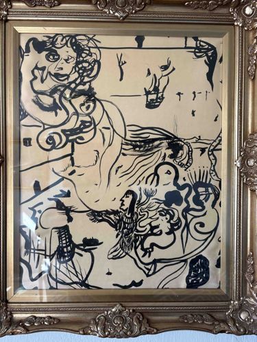 This item is a framed ink drawing executed in a bold, black line against a tan or light brown paper substrate. The artwork displays a complex Surrealist composition featuring distorted human figures, swirling curvilinear forms, and abstract motifs consistent with mid-20th-century experimentation in automatic drawing. The central figure on the left appears large and monumental, with fluid lines suggesting movement and anatomical distortion. Smaller, more detailed figures and silhouettes populate the lower and right-hand quadrants of the image. The lines vary in thickness, indicating the use of a brush or broad-nibbed pen. The paper shows slight undulations, suggesting it is not perfectly flat within the frame. The artwork is housed in a highly ornate, Rococo-style gold-tone frame featuring elaborate shell and floral scrollwork (c-scrolls) and a beaded inner border. The gilding on the frame shows a soft luster, with some darkening in the recessed areas (patina) consistent with age. There are no visible signatures or dates in the provided view, though the style is reminiscent of works by artists such as Salvador Dalí or those within the CoBrA movement. The condition appears stable, though there is potential light foxing or subtle discoloration on the paper consistent with vintage materials. The contrast between the heavy, traditional frame and the modern, fluid ink work creates a striking juxtaposition.
