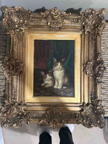 An oil painting on board or canvas depicting a domestic cat and a kitten seated against a dark interior backdrop with a draped green curtain and a patterned rug. The artwork is characterized by typical late 19th-century animalier styling, focusing on the personalities and innocence of the subjects. The larger cat is bicolored (likely tabby and white) with a small pink collar or ribbon, while the smaller kitten rests beside it. The painting is housed in an exceptionally ornate, heavy rococo-revival style giltwood and gesso frame. The frame features large shell-motif cartouches at the corners and centers, connected by floral swags and scrollwork. The finish is an antique gold leaf or bronze paint with a dark patina in the recesses. Condition-wise, the frame shows moderate wear with visible paint loss and gesso cracking on the inner gold spacer (slip), and some chips to the high-relief ornamentation typical of its age. The painting surface appears somewhat darkened by age-related varnish yellowing. Overall, the piece reflects the Victorian era's sentimental taste in pet portraiture and high-style interior decor, with mid-to-high level craftsmanship on the frame's intricate molding.
