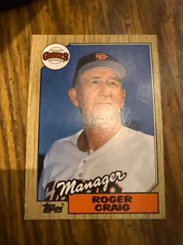 This is a standard-sized (2.5 by 3.5 inches) vintage baseball card produced by Topps in 1987. The card features Roger Craig, then manager of the San Francisco Giants. The iconic design of the 1987 Topps set is instantly recognizable by its wood-grain printed borders, which mimic a wood panel texture. The front shows a color portrait of Craig in a professional Giants manager's uniform against a blue background. Design elements include a circular team logo in the top left, the designation 'Manager' in cursive script above a burnt-orange nameplate, and the classic Topps logo in the bottom left corner. The card is printed on typical cardstock paper common for the late 1980s junk wax era. Visible condition analysis shows slightly soft corners, particularly at the bottom right, and some minor surface wear. The centering appears slightly heavy toward the left and top borders. No major creases or staining are visible from this orientation. The wood-grain border shows minimal chipping, which is a common issue for this specific year's set. This specific card represents an era of high-volume production in the sports card industry, specifically the late 1980s.