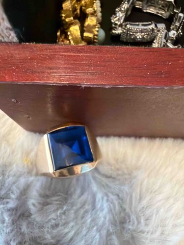 This is a men's signet-style ring crafted in 10k yellow gold, featuring a large, lab-created blue sapphire. The central stone is an emerald-cut or square-faceted synthetic sapphire with a rich, dark blue saturation. It is securely bezel-set within a chunky, high-polish yellow gold mounting that tapers into a wide shank. The design is characteristic of mid-to-late 20th-century men's jewelry, approximately circa 1970s-1980s, prioritizing a bold and masculine aesthetic. The gold shows minor surface scratches and a light patina consistent with moderate wear, but the overall structure appears sound. The stone exhibits decent clarity with no visible major chips along the facets from this perspective. The craftsmanship is typical of commercial-grade fine jewelry, likely featuring a hollowed-out under-gallery to reduce weight while maintaining a substantial appearance. While no hallmark is visible in the photo, the provided context indicates a 10k gold purity. Its substantial width and classic rectangular face make it a prominent accessory from its era.
