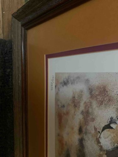 This item is a limited edition fine art print, professionally matted and framed. The artwork features an impressionistic or watercolor-style composition with a palette of earth tones, including rust, ochre, sienna, and charcoal, possibly depicting a golfer or similar sports figure given the context of the artist's known work. A critical identifying feature is the pencil-written numbering '139/2250' located in the upper left margin of the paper, indicating a large production run for the edition. The print is housed under glass and double-matted; the inner mat is a deep burgundy/maroon fillet which provides a sharp contrast, while the outer mat is a wide, warm mustard or gold-toned board. The frame is constructed of stained dark wood with a visible grain and a traditional bevel. Regarding condition, the frame shows some minor surface abrasions and dust accumulation consistent with age, likely dating to the late 20th century (1980s-1990s). The print appears slightly wavy under the mat, which may indicate it is not fully laid flat or has reacted to humidity. Based on the artist's name provided, this is likely a work by the popular sports artist Wayland Moore or more likely a similar mass-market contemporary like Jan McLaughlin, known for commercial lithography. The craftsmanship of the framing is professional-grade, suggesting it was intended for office or home gallery display.