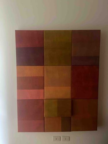 This contemporary artwork is a large-scale, multi-paneled wall installation consisting of nine rectangular canvases arranged in a 3x3 grid. The composition is a study in color theory and minimalist abstraction, utilizing a warm, earth-toned palette that includes shades of terracotta, deep burgundy, mustard yellow, ochre, and muted siennas. Each panel is individually stretched over a thick wooden frame, creating a deep profile that adds a sculptural dimension to the piece. A notable feature is the three-dimensional variation in the bottom-center panel, which appears to be layered or cantilevered outward, breaking the flat plane of the grid. The surfaces exhibit a soft, matte finish with subtle tonal gradations and horizontally divided fields of color within individual panels, suggesting a technique involving thin glazes or a finely textured pigment application. The craftsmanship appears precise, with clean edges and uniform tension across the canvases. Condition-wise, the piece appears well-maintained, showing no visible surface abrasions, sagging, or fading, indicating a modern manufacture date, likely late 20th to early 21st century. The style reflects a convergence of Color Field painting and mid-century Modernism, focusing on the interplay of geometry and saturated hues.