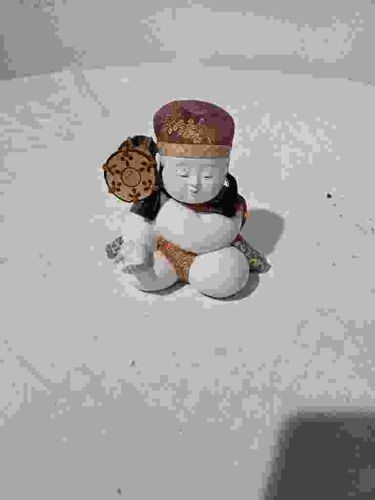 This is a traditional Japanese Gosho-ningyo (Palace Doll) figurine depicting a plump, seated child-like figure. The doll features the characteristic white, porcelain-like finish of 'gofun,' a traditional material made from crushed oyster shells and glue. The figure is styled with a distinct purple and gold brocade cap (eboshi) and a matching loincloth sash (haragake). To its side, it carries a miniature wooden property drum or accessory with a wheel design. The doll has a serene expression with delicate, painted facial features including slit eyes and rosy lips. Structurally, the figure appears to be in good vintage condition, though the image resolution limits a full assessment of surface micro-cracking common in older gofun. The craftsmanship reflects Mid-20th Century Showa-era production, noted for the high-quality textile application and subtle modeling of the figure's rounded 'fukure' form. The overall aesthetic is one of auspiciousness and health, typical of dolls presented as gifts to royal or noble households.