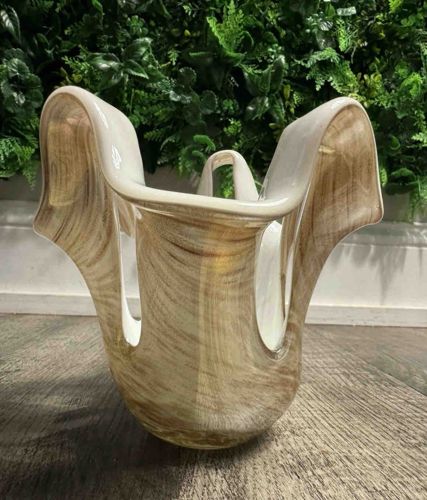 This mid-century modern art glass vase features a distinctive hand-blown 'handkerchief' or 'swung' silhouette, characterized by four dramatic upright folds that create a petal-like or folded-fabric aesthetic. The piece is constructed with internal gold aventurine (gold flecks), which is a labor-intensive technique involving the suspension of copper crystals within the glass to create a shimmering bronze and gold aesthetic. This metallic layering is set against an opaque cream or latte-colored base. The vase's organic, undulating rim demonstrates high-quality craftsmanship through its thin yet uniform edges and symmetrical folding. While no specific maker's mark is visible in the image, the style and gold aventurine inclusions are hallmarks of mid-20th-century Murano glassmaking, likely dating from the 1950s to the 1970s. The piece maintains a smooth, glossy finish with no evident cracks, deep scratches, or significant clouding, though standard shelf wear to the base can be anticipated. The interior appears consistent with the exterior coloration, suggesting a solid or heavily cased glass construction. Its abstract, sculptural form serves as both a functional vessel and a decorative statement piece typical of the Venetian glass tradition.