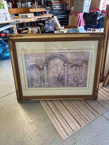 This is a large-scale, decorative matted print housed in an ornate wood frame, exhibiting a transitional aesthetic popular in the 1990s. The artwork features a composition of classical Romanesque or Tuscan arched colonnades in a muted, earth-toned palette of sienna, ochre, and taupe. Centered within the foreground arch is a singular, tall botanical specimen, likely a lily or agapanthus, which softens the rigid architectural lines. The print is professionally mounted with a double-matting system, decorative inset border lines, and protected behind glass. The frame itself is of substantial construction, featuring a gilded metallic finish with heavy decorative molding at the corners and along the perimeter, imitating traditional plaster-on-wood techniques from the late 20th century. Based on the provided context of 30 years and the visible style, this is a commercial decor piece manufactured in the early-to-mid 1990s. The condition appears stable with minor surface wear to the frame corners and light dusting, though the matting shows no visible signs of significant foxing or water damage. The craftsmanship is typical of high-end home furnishings retailers of the era, focusing on monumental scale and traditional European motifs to suit spacious interior foyers or dining rooms.