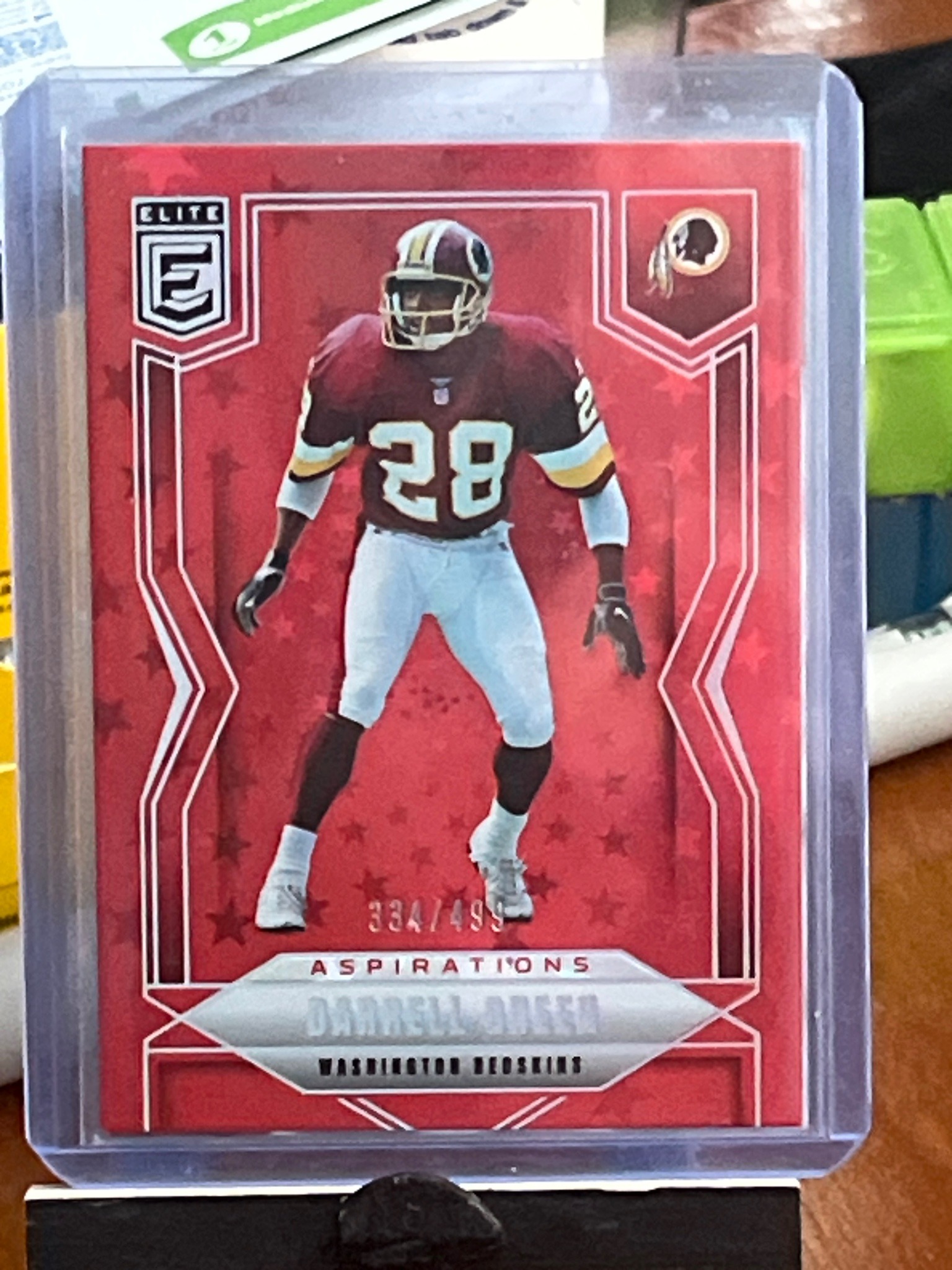 This is a modern Donruss Elite 'Aspirations' parallel football trading card featuring Hall of Fame cornerback Darrell Green of the Washington Redskins. The card features a vibrant red foil background with a subtle repeating star pattern and geometric border lines. The player is depicted in his classic burgundy and gold home uniform, wearing number 28. A key distinguishing feature is the stamped serial number '334/499' located near the player's feet, indicating it is a limited print run production. The card bears the 'Elite' brand logo in the upper left and the team logo in the upper right. It is housed in a clear protective plastic top-loader for preservation. Regarding condition, the card appears to have crisp corners and clean edges through the holder, though a microscopic examination would be required to verify surface perfection. The centering of the image and the text alignment are consistent with high manufacturing standards typical of the 2010s-2020s Panini/Donruss era. The metallic finish adds a layer of premium craftsmanship compared to standard base cards, making it a desirable piece for sports memorabilia collectors.
