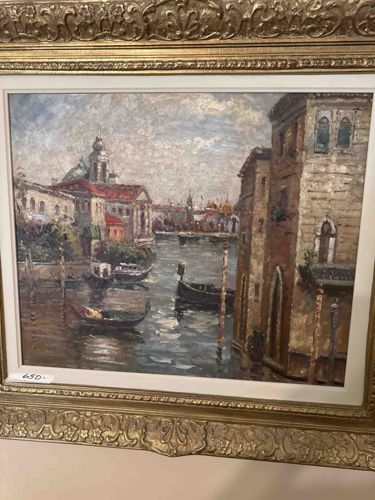 This is an original oil painting on canvas depicting a classic Venetian canal scene, likely the Grand Canal, executed in a mid-to-late 20th-century impressionistic style. The artwork features foundational elements of Venice architecture, including arched windows and red-tiled roofs, alongside iconic gondolas and mooring poles (pali di casada) punctuated with reflections in the water. The technique utilizes a thick impasto with visible palette knife work and expressive brushstrokes, conveying a sense of atmospheric light and movement. The color palette is composed of muted earth tones, ochres, and siennas for the buildings, contrasted against cool grays and blues in the sky and water. The painting is housed in a substantial, ornate gilded wood and gesso frame featuring elaborate rococo-style scrollwork and floral relief. A white wooden linen liner creates a transition between the art and the frame. While no signature is immediately visible in the lower corners in this view, the overall quality suggests a skilled hand working in the European academic tradition of the mid-1900s. The condition appears stable, though there is some light cracking (craquelure) typical of aged oil media and minor dust accumulation on the textured surface. The frame shows slight wear to the gilt finish but remains structurally sound. A small price tag of '650' is visible on the liner, possibly indicating a gallery or estate sale price.