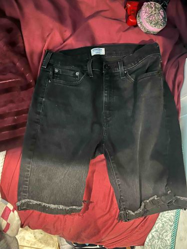 This item is a pair of men's or unisex denim cut-off shorts in a faded black or charcoal wash. The garment is constructed from a heavy-weight cotton or cotton-blend denim fabric, typical of the Denizen line by Levi Strauss & Co. Physical characteristics include a classic five-pocket design, a zip fly with a top button closure, and integrated belt loops. A notable marking is the rectangular white fabric brand label located on the interior back waistband, prominently featuring the 'Denizen' and 'Levi's' logos in blue text. The construction shows double-needle stitching in tonal black thread for durability along the seams and pocket reinforcements. The most distinguishing condition feature is the crudely cut, raw, and frayed hemline on both legs, indicating these were previously full-length jeans that have been modified by the owner. There is visible fading and 'whiskering' around the crotch and thighs, suggesting moderate wear and a 'broken-in' aesthetic. The metal rivets on the pockets appear oxidized or finished in a dark gunmetal tone. Based on the branding styles, these are contemporary mass-market apparel items, likely from the last 5-10 years. Craftsmanship is standard for commercial-grade retail denim, prioritizing utility over luxury finishing.