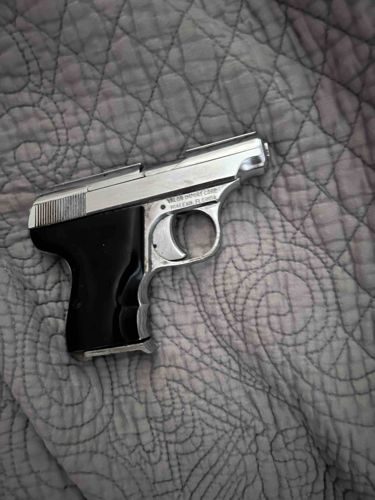This is a sub-compact, semi-automatic 'pocket pistol' chambered in .25 ACP. Physically, the firearm features a polished chrome or nickel finish on the slide and frame, paired with black synthetic (likely plastic or Bakelite) grip panels. The design is characterized by a striker-fired action with a slide-mounted safety and a heel magazine release. The frame is marked with 'VALOR IMPORT CORP / MIAMI, FLORIDA,' which identifies it as a budget-friendly firearm imported to the United States primarily during the late 1960s. The construction utilizes a simple blowback operation, typical of inexpensive 'Saturday Night Special' firearms of the era. Visible condition includes moderate surface scratches and minor pitting consistent with age and storage. The finish shows some dulling and surface wear near the muzzle and trigger guard. The grip panels appear intact without significant cracks, though they show handling marks. The craftsmanship is utility-grade, featuring cast components and basic serrations on the rear of the slide for grip. These pistols were manufactured for the low-cost self-defense market and are notable more for their historical context regarding 20th-century U.S. import laws than for mechanical refinement.