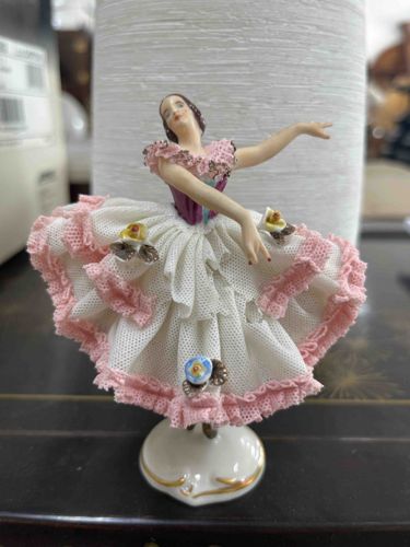 This is a vintage hand-painted porcelain figurine depicting a female ballet dancer in a graceful, active pose. The piece is crafted in the 'Dresden Lace' style, characterized by the intricate, real-lace-dipped porcelain technique used to create the voluminous ballerina skirt and ruffled neck collar. The tutu features multiple tiers of fine textured white lace with delicate pink ruffled trim and is further embellished with small, hand-modeled applied floral blossoms (yellow and blue) with green leaves. The ballerina wears a deep magenta or plum-colored bodice with gold-gilt accents at the neckline. Physically, the figure stands on a circular, glazed white porcelain base decorated with scrolling gold-leaf patterns. Her face is finely painted with delicate features, and her dark hair is styled in a classical Victorian or early 20th-century bun. In terms of condition, the delicate lace appears remarkably intact, though there is a visible chip or missing section of lace on the left side of the skirt (viewer's right). Small chips on the petals of the applied flowers are also likely given the fragile nature of this craftsmanship. Based on the style and construction, this piece likely originates from mid-20th-century Germany (Dresden or Thuringia regions), mimicking the high-quality 19th-century aesthetics of manufacturers like Sitzendorf or Muller & Co. The craftsmanship is high, demonstrating the painstaking 'porcelain lace' process where fabric is dipped in slip and fired away in a kiln.
