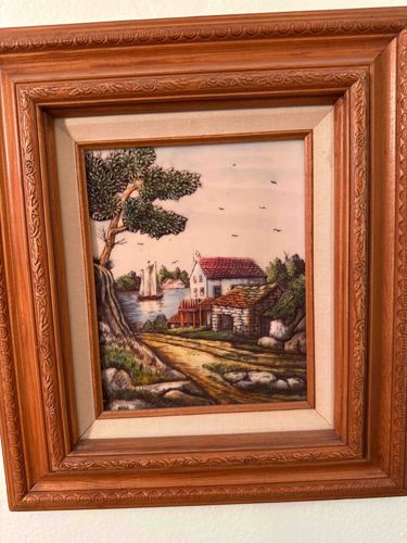 A decorative wall hanging featuring a rectangular ceramic or porcelain tile with a raised, hand-painted bas-relief scene depicting a European-style coastal landscape. The artwork illustrates a white cottage with a red-tiled roof and an adjacent stone outbuilding situated along a winding dirt path overlooking a harbor. A three-masted sailboat lies on the water under a sky filled with small birds. The foreground is dominated by a stylistic, textured tree with dense foliage and rocky terrain. The tile utilizes a palette of earthy ochre, deep greens, and subdued whites. It is set within a multi-layered framing system consisting of a textured fabric (linen-style) inner liner and a wide, carved wooden frame. The frame features an ornate C-scroll or shell motif repeating along the outer molding, finished in a medium-toned walnut or cherry stain. Based on the style of the relief and the frame's construction, this piece likely dates to the mid-to-late 20th century (1960s-1970s). The condition appears good with no visible chips to the ceramic, although there is minor darkening to the fabric liner consistent with age. There are no readily visible maker's marks or signatures on the front of the tile, suggesting it may be a high-quality decorative souvenir or factory-produced art piece from the Mediterranean or European region.