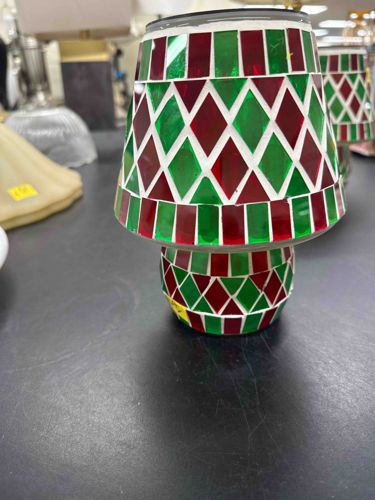 This item is a decorative table lamp, likely a tea light or votive candle holder, featuring a mushroom-like silhouette. The construction consists of a glass base and shade entirely encased in a mosaic of multi-colored glass tiles. The primary aesthetic is defined by a harlequin or diamond pattern in alternating emerald green and ruby red translucent glass pieces, bordered by rectangular bands of the same colors at the top and bottom rims. White grout or cement is used to secure the tesserae, creating a high-contrast lattice effect. The piece stands approximately 6 to 8 inches tall. The craftsmanship suggests a contemporary mass-produced decorative item, common in the late 20th to early 21st century, often sold in home goods or gift shops. Condition-wise, the grout appears intact with no visible cracks, though some minor adhesive residue or dust is present near the top rim. The glass tiles exhibit a glossy finish, typical of stained glass scraps used in mosaic art. No specific maker's marks or signatures are visible in the provided image, though a small yellow price or inventory tag is attached to the lower base, suggesting it is currently in a retail or resale environment.