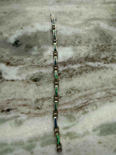 This item is a contemporary link bracelet featuring inlaid segments of lab-created (synthetic) opal. The bracelet is constructed of a metallic material, likely sterling silver based on the color and common pairing with this style of inlay. It consists of multiple rectangular bar-shaped links, each hosting a channel-set panel of vibrant green and blue fire opal. The links are connected by small circular or figure-eight joints that allow for flexibility and fluid movement around the wrist. The iridescent play-of-color within the opal segments displays strong flashes of emerald green and deep cobalt blue, characteristic of laboratory-grown gems. The bracelet features a fold-over or box-style clasp at one end for secure fastening. In terms of condition, there appears to be slight surface oxidation or tarnishing consistent with silver alloy, but the inlay remains intact without visible cracks or missing sections. The craftsmanship is clean, indicating a modern manufacturing process, likely from the late 20th or early 21st century. While no maker's mark is visible from this angle, the style is reminiscent of Southwestern or commercial fashion jewelry designs. Overall, the piece presents well with no structural damage or notable repairs.