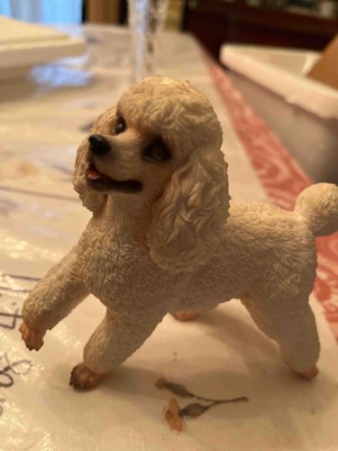 This is a detailed miniature figurine of a white poodle, appearing to be crafted from cast resin or a similar cold-cast plastic material. The piece measures approximately 2 to 3 inches in height. It features an off-white or cream-colored matte finish with a highly textured surface designed to replicate the characteristic tight curls of a poodle's coat. The dog is depicted in a playful, dynamic stance with its front right paw slightly lifted and its head turned to the side, exhibiting an alert expression. The face is meticulously painted with dark, glossy eyes, a black nose, and a slightly open mouth revealing a hint of pink tongue and black gum line. Notable shading is applied around the muzzle and eyes to give the piece a more realistic, lifelike depth. Despite being a small-scale collectible, the craftsmanship shows fine attention to anatomical proportions and fur texture. Condition-wise, the item appears well-preserved with no visible chips, cracks, or significant scuffing, though minor dust accumulation is present in the deep crevices of the molded fur. This style of figurine is consistent with giftware and animal collectibles produced from the late 20th century to the present day, often found in series like 'The Danbury Mint' or similar boutique collectible brands.