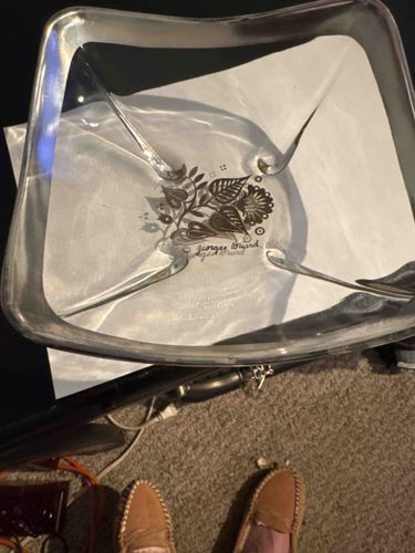 This is a Mid-Century Modern square glass serving bowl designed by the iconic American designer Georges Briard. The piece features a clear glass body with a thick, silver-tone or silver-plated metal rim that adds a reflective, luxurious finish typical of the era. Centered at the bottom of the bowl is an intricate metallic floral and leaf motif, executed in a style reminiscent of Swedish or folk art influences. Below the center design, the 'Georges Briard' signature is clearly visible, marking it as an authentic piece of mid-20th-century glassware. The bowl's shape is slightly curved with rounded corners, measuring approximately 8 to 10 inches across. In terms of condition, there appears to be significant tarnish and some wear on the silver-toned rim, which is characteristic of vintage silver-plated items that have not been polished. The central design remains mostly intact, though some minor fading or scratching may be present upon closer physical inspection. This item likely dates to the 1950s or 1960s and represents a prime example of accessible high-end decorative housewares from that period.