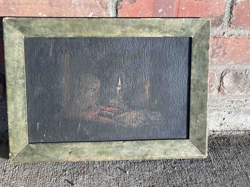 This is an antique oil painting executed in a somber, Tenebrist style, likely dating from the late 19th to early 20th century. The composition features a low-light still life arrangement centered around a single glowing candle, which illuminates nearby objects including what appears to be a skull (Memento Mori motif) and various books or scrolls. The artwork is characterized by a heavy 'impasto' texture and a prominent canvas grain, which suggests it was painted on a coarse linen or a prepared artist board. The color palette is extremely restricted, dominated by deep ochres, burnt umbers, and lamp blacks, with the only bright focal point being the yellow-white of the candle flame. The piece is housed in a wide, flat-profile timber frame that has been painted or gilded in a muted greenish-gold tone, now showing significant distress. Regarding condition, the painting exhibits heavy surface grime and a yellowed varnish that has likely darkened the original pigments. There is visible edge wear along the frame, including abrasions and small chips to the finish, along with some minor paint loss spots on the lower-left section of the canvas. The overall presentation suggests a piece that was intentionally crafted to mimic the Old Master style of the 17th century, emphasizing dramatic light and shadow (chiaroscuro). No signature is immediately visible in the lower registers, which is common for academic studies or works from this period favoring a moody, atmospheric aesthetic.